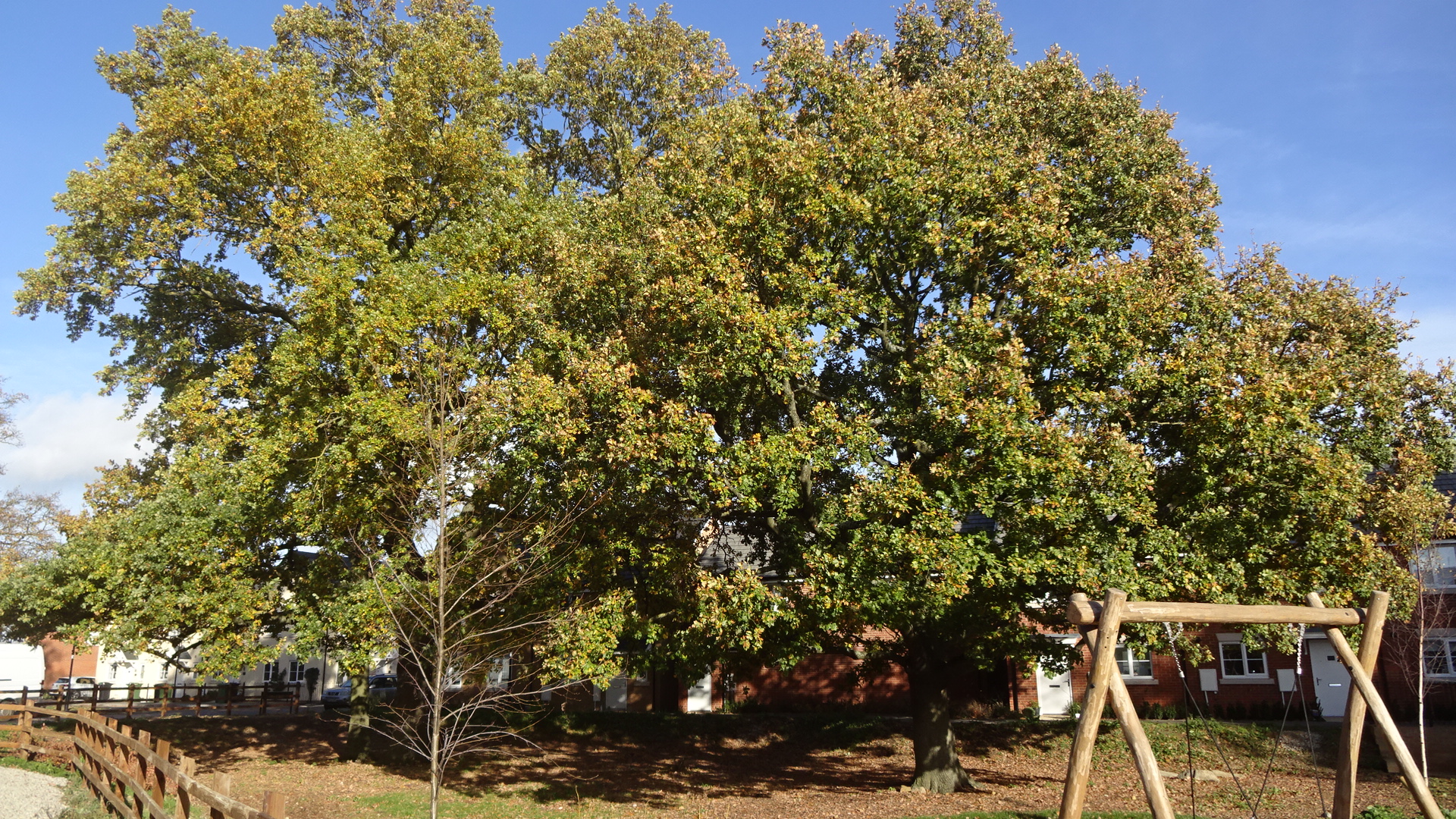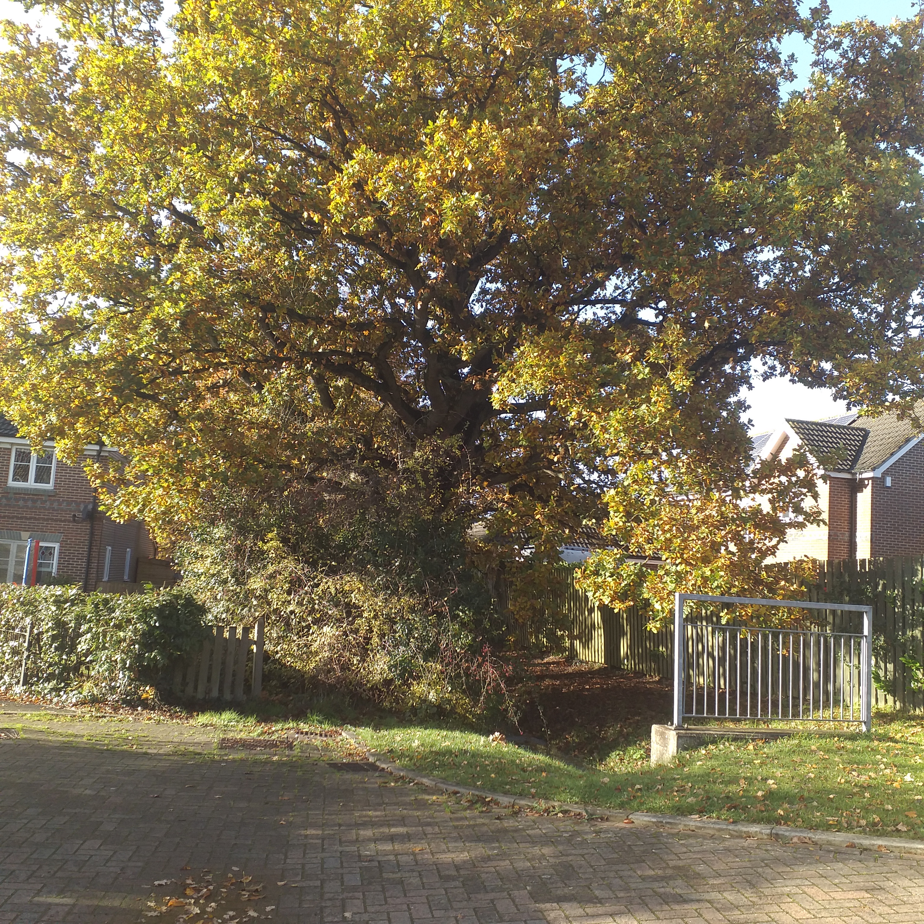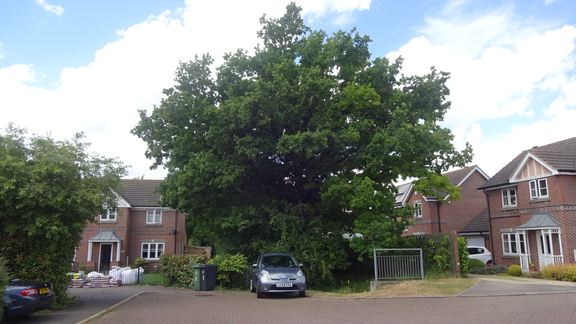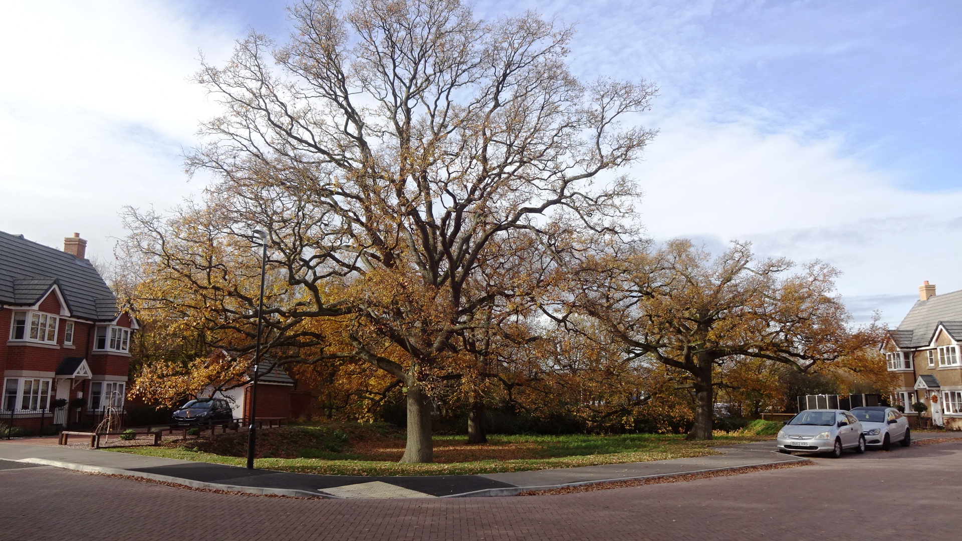 OAKEND LEA + TESCO Oakend Lea, east of Tesco and south of the A4130 road to Wallingford, contains perhaps Didcot's largest concentration of mature oak trees – 28 of them. The original site was quite marshy, so the housing development has been built on raised land, leaving the trees to occupy their original areas below estate level. The oaks are certainly something to marvel at, but if you go to the southernmost end of Oakend Lea, nearest the railway, and venture into a wooded group of trees, you may encounter the dis-spiriting remains of mature trees that were felled as part of the development because they had been damaged by storms and/or affected by disease. Some of the tree depressions are surrounded by steep banks, so can be difficult to get into, and beware that they still retain their marshy character – a ready supply of water is of course what has helped these oaks to grow to such good sizes. Finally, in the north-east corner of Tesco car park, is a fairly mature oak.