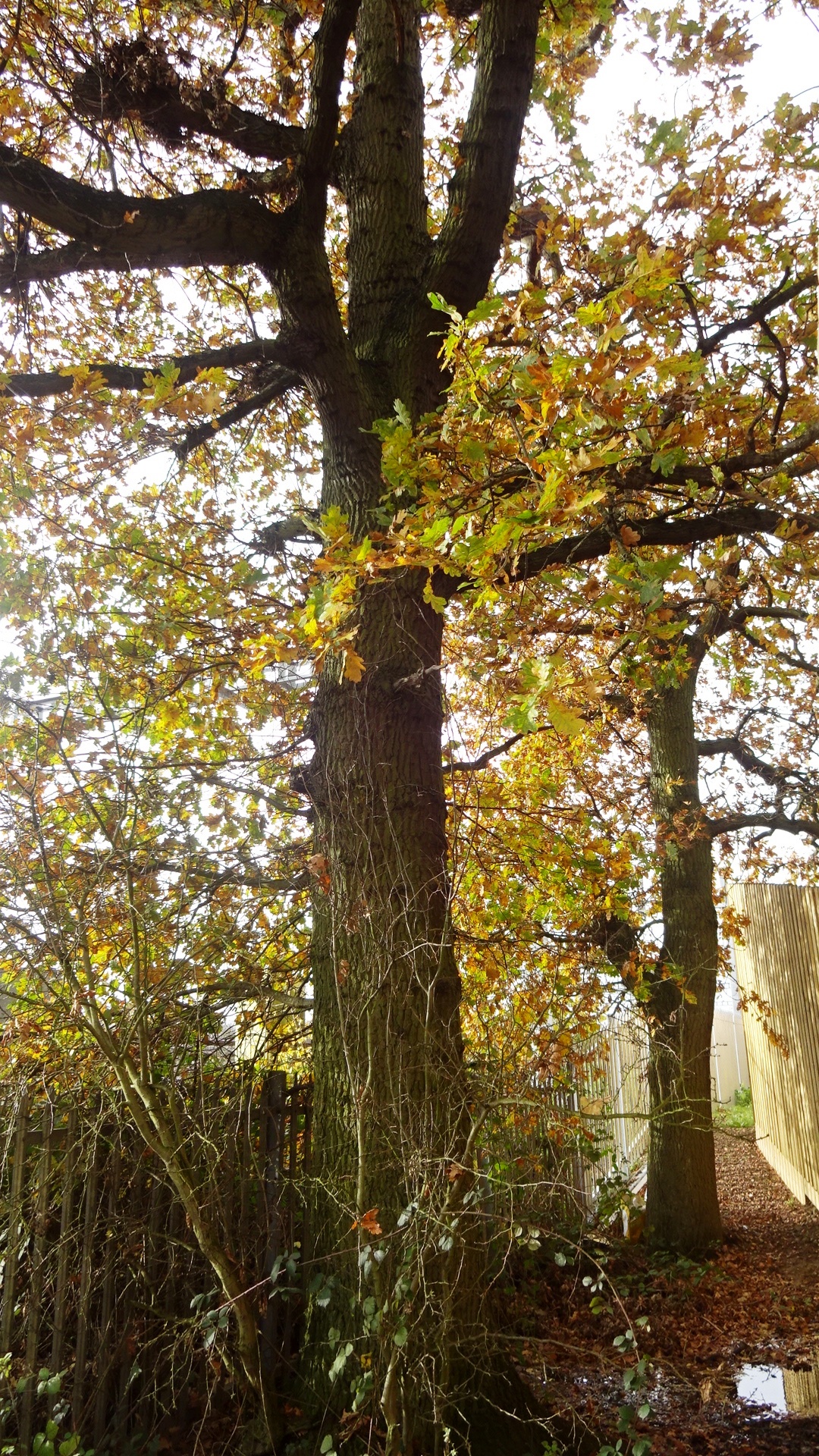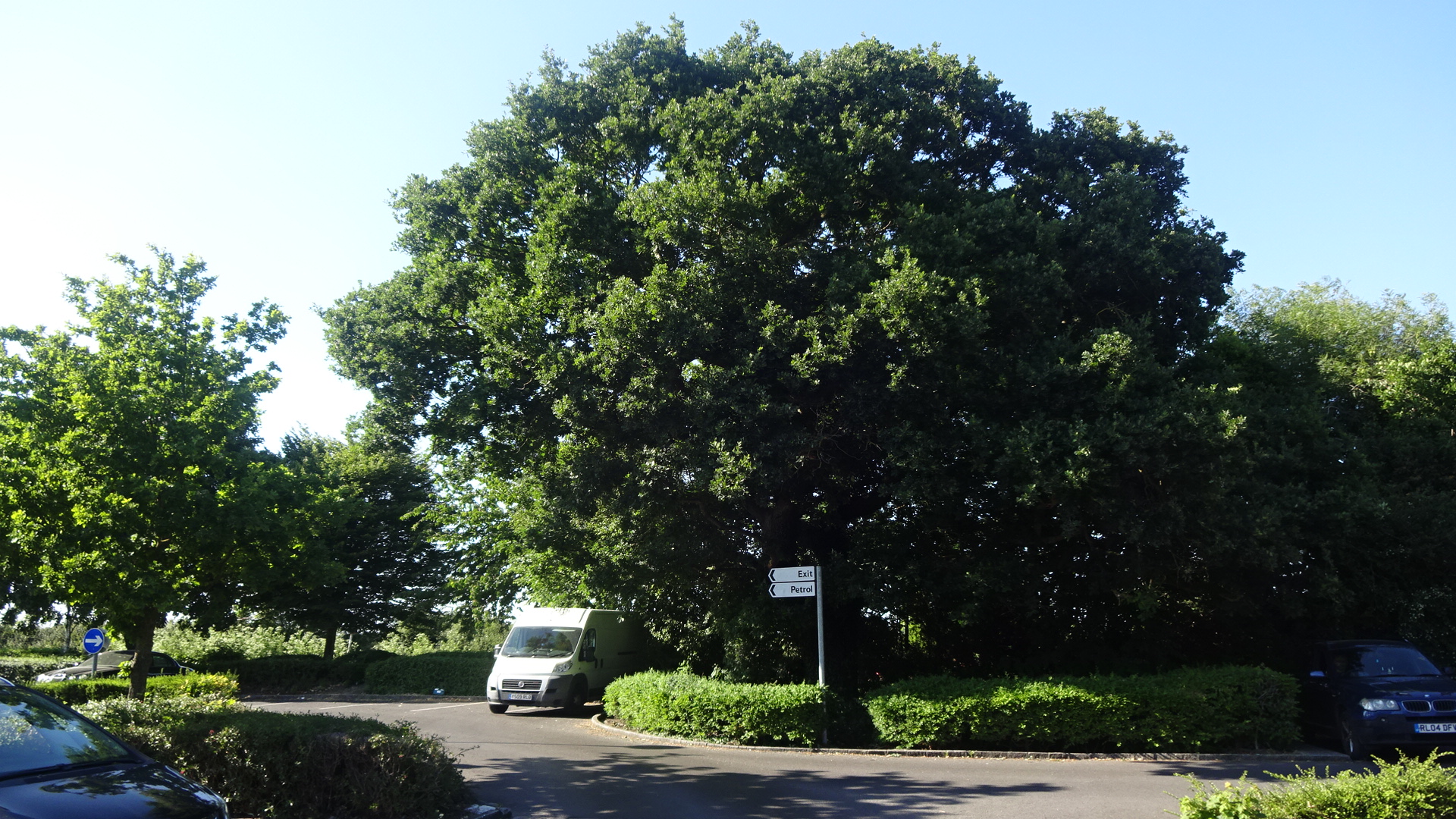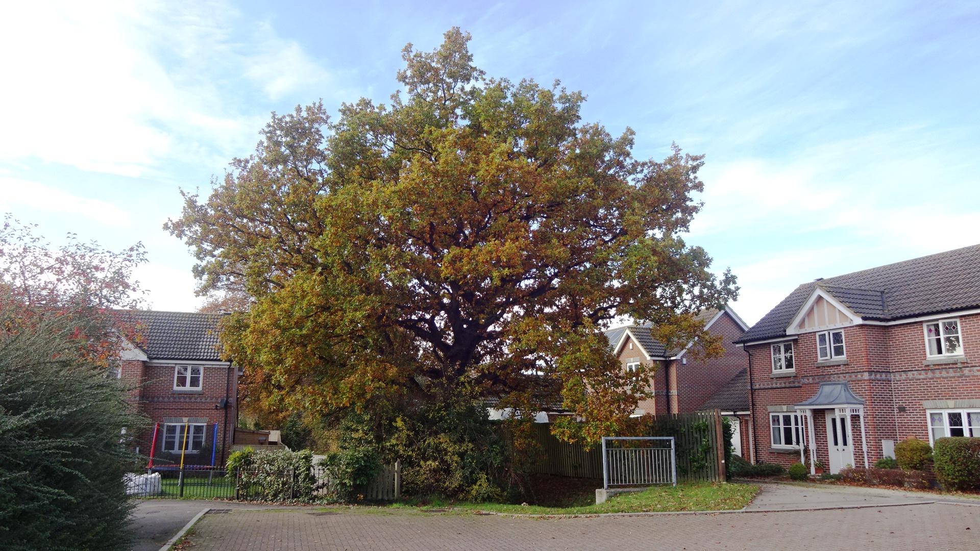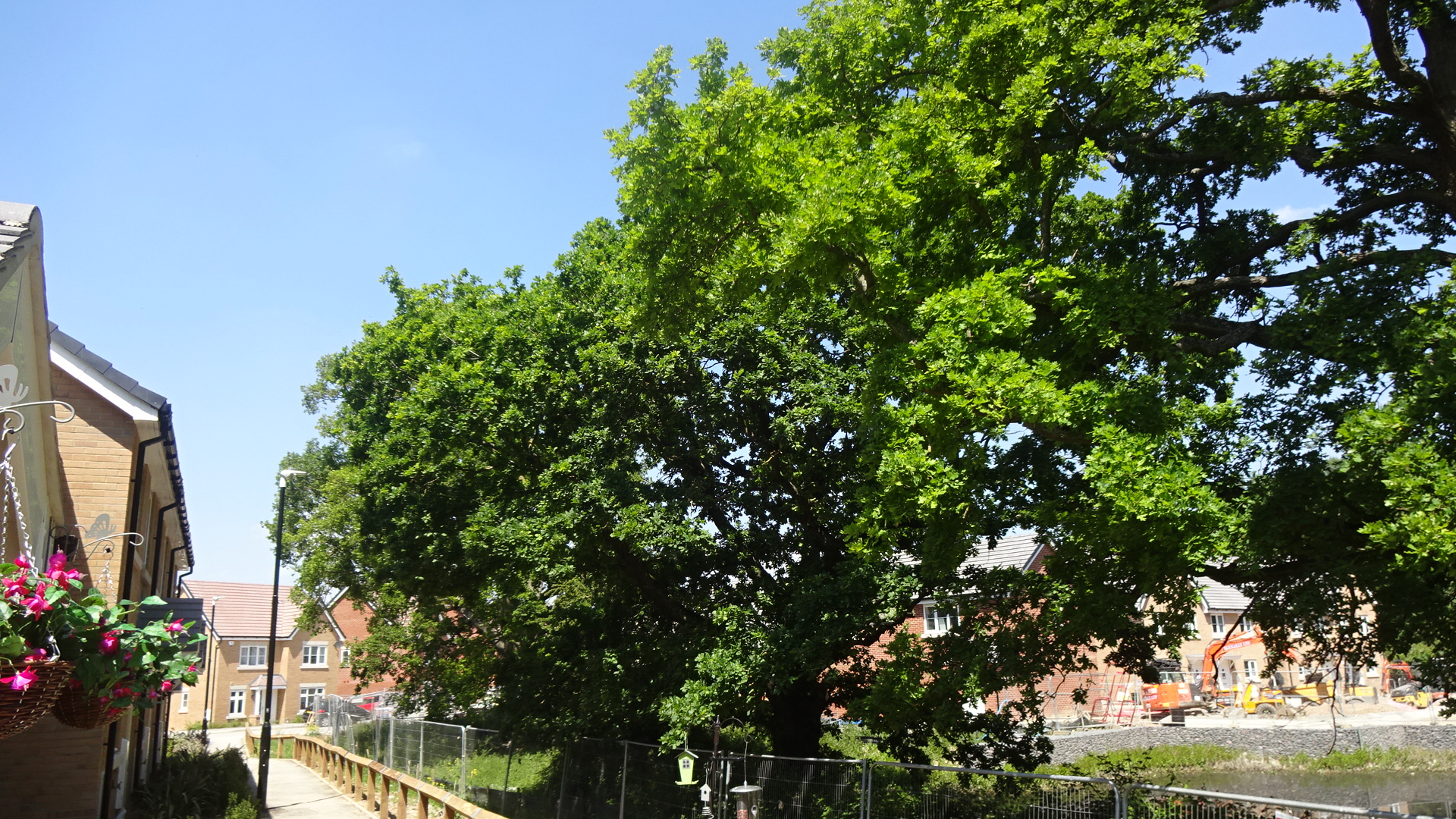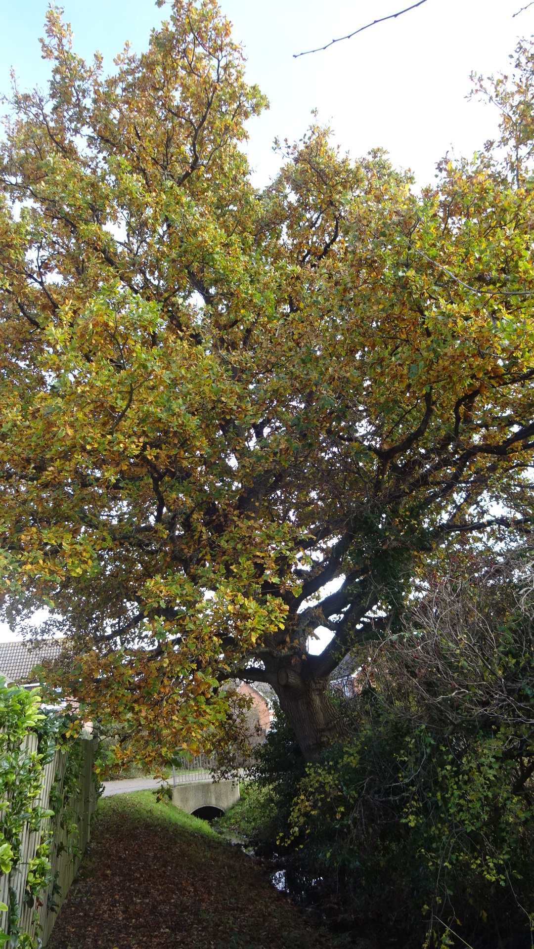 OAKEND LEA + TESCO Oakend Lea, east of Tesco and south of the A4130 road to Wallingford, contains perhaps Didcot's largest concentration of mature oak trees – 28 of them. The original site was quite marshy, so the housing development has been built on raised land, leaving the trees to occupy their original areas below estate level. The oaks are certainly something to marvel at, but if you go to the southernmost end of Oakend Lea, nearest the railway, and venture into a wooded group of trees, you may encounter the dis-spiriting remains of mature trees that were felled as part of the development because they had been damaged by storms and/or affected by disease. Some of the tree depressions are surrounded by steep banks, so can be difficult to get into, and beware that they still retain their marshy character – a ready supply of water is of course what has helped these oaks to grow to such good sizes. Finally, in the north-east corner of Tesco car park, is a fairly mature oak.