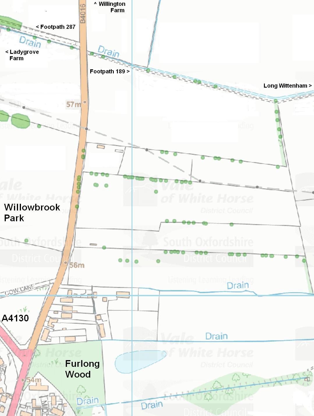 FURLONGS The Furlongs estate, east of the B4016 Abingdon Road and built around 2000, contains a few mature trees, but few of them are accessible. To its north, the western part of Furlong Wood is at risk from the 'Marsh' / Ladygrove Eastplanning application, as this includes the final extension of the Northern Perimeter Road (A4130) which will provide the main access to the new site as well as relieving traffic congestion around Tesco and the roundabout to the west by Marsh Bridge.